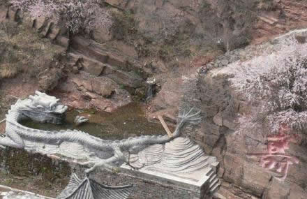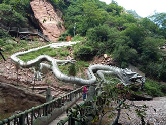 老龍?zhí)队升垖m瀑布鑿蝕而成,潭周邊人工雕筑的巨龍,表現(xiàn)手法抽象,像長在崖壁上的一條巖脈,騰云飛舞氣勢磅礴。