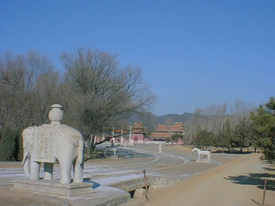 孝陵神路長約6公里,南起金星山下的石牌坊,北到昌瑞山下的寶城、室頂,沿朝山、案山、靠山的三山連線,將孝陵的數(shù)十座建筑相貫串,形成陵區(qū)建筑中軸線。孝陵神路是清陵中最長的神路。