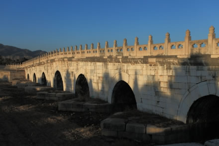 拱形橋在石橋中是等級最高的一種。七孔拱橋在清東陵只孝陵有一座。橋長110米,兩側(cè)安設(shè)石欄板126塊,石望柱128根,抱鼓石4塊。