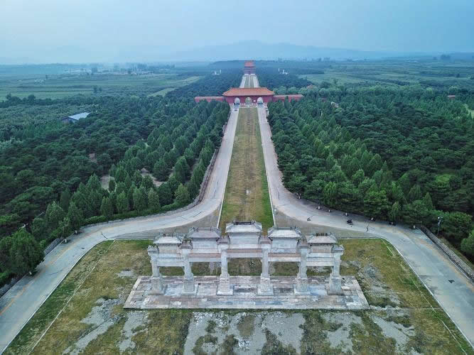 入關(guān)第一帝世祖順治皇帝的孝陵位于南起金星山,北達昌瑞山主峰的中軸線上,其余皇帝陵寢則以孝陵為中軸線按照“居中為尊”、“長幼有序”、“尊卑有別”的傳統(tǒng)觀念依山勢在孝陵的兩側(cè)呈扇形東西排列開來。各陵按規(guī)制營建了一系列建筑,總體布局為"前朝后寢"!鞍俪邽樾,千尺為勢”的審美思想貫穿于每一座陵寢建筑中。