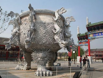 九龍鼎采用杯、羹、匙、盅、盤、碟、碗等青花玲瓏瓷具近4萬(wàn)件,鼎高和直徑均為6米,最大處直徑10米,通過(guò)資深彩燈匠人利用棉線,親手捆扎手工編織而成。各類瓷器都按照設(shè)計(jì)圖紙標(biāo)準(zhǔn)施工,制作工藝精巧、制作過(guò)程嚴(yán)謹(jǐn)。主體為鋼結(jié)構(gòu),整體外光源,龍頭有LED追光變幻和噴霧效果。其創(chuàng)意深邃,規(guī);趾,構(gòu)思巧妙、制作精致、氣勢(shì)磅礴,既露王者風(fēng)范又顯民俗特色。