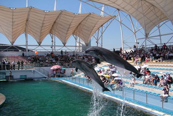 海豚表演館于2000年5月1日正式營(yíng)業(yè),投資近6000萬元人民幣,占地面積約3000平方米。三面環(huán)座的看臺(tái)可同時(shí)容納2000名游客,站在看臺(tái)極目遠(yuǎn)眺,表演池和大海仿佛融為一體。在優(yōu)美音樂的伴隨下,不僅可以欣賞到海豚的水中華爾茲、空中頂球、跳圈、跨桿、環(huán)場(chǎng)鞠躬跳等高難度的精彩表演;還可以領(lǐng)略海獅投籃、水中霹靂舞、中國(guó)功夫等出色的演技;同時(shí)您還有機(jī)會(huì)親身觸摸海豚,與它握手交流,共同感受人與自然默契相通的美好境界。