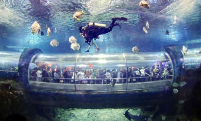 海底世界水族館飼養(yǎng)著來自世界各地的海洋動(dòng)物200多種,共10,000多艉(頭),其中有大量國(guó)家一級(jí)、二級(jí)珍稀保護(hù)動(dòng)物,檸檬鯊、豹紋鯊、護(hù)士鯊、海豚、江豚、綠海龜、海獅、海豹、蝠鲼、海狗供游人觀賞。270度環(huán)形的亞克力玻璃圍成的海底隧道全長(zhǎng)100米左右,五光十色的珊瑚環(huán)繞在您的周圍,迷人的海底動(dòng)植物盡收眼底。透過窗口還可以看到一個(gè)古羅馬被海水淹沒城市的石像造景。海豚表演館占地面積1萬平方米,建筑面積3,000平方米,總貯水量200萬千克,能同時(shí)容納2000多人同時(shí)觀看表演,以展示生活在海洋中哺乳動(dòng)物的海獸表演為主,是一座具有國(guó)際標(biāo)準(zhǔn)的海洋動(dòng)物表演劇場(chǎng)。游客在此可以看到聰明可愛的海豚和滑稽可笑的海獅聯(lián)袂上演精彩紛呈的各項(xiàng)表演:海獅獻(xiàn)上迪斯科、倒立平衡、一獅兩球、套彩圈、單手倒立、頂球過障礙、親吻、水中交誼舞等一系列惟妙惟肖的表演;海豚上演的水中芭蕾舞、踢足球、環(huán)場(chǎng)鞠躬跳躍、伴著樂曲引吭高歌以及充分展示海豚智力的各種表演活動(dòng)。