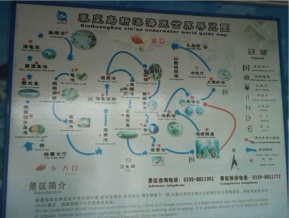 秦皇島新澳海底世界總建筑面積約2萬平方米,總儲(chǔ)水量約650萬千克。景區(qū)主要由水族館和海豚表演館兩部分組成,其中,水族館主要包括小池區(qū)、企鵝館、海豹館、觸摸池、海底隧道、表演區(qū)、科普展廳、科普教室以及海洋精品店等部分組成。