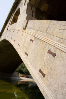 在主券上均勻沿橋?qū)挿较蛟O(shè)置5個(gè)鐵拉桿,穿過28道拱券,每個(gè)拉桿的兩端有半圓形桿頭露在石外,以夾住28道拱券,增強(qiáng)其橫向聯(lián)系;4個(gè)小拱上也各有一根鐵拉桿起同樣作用。