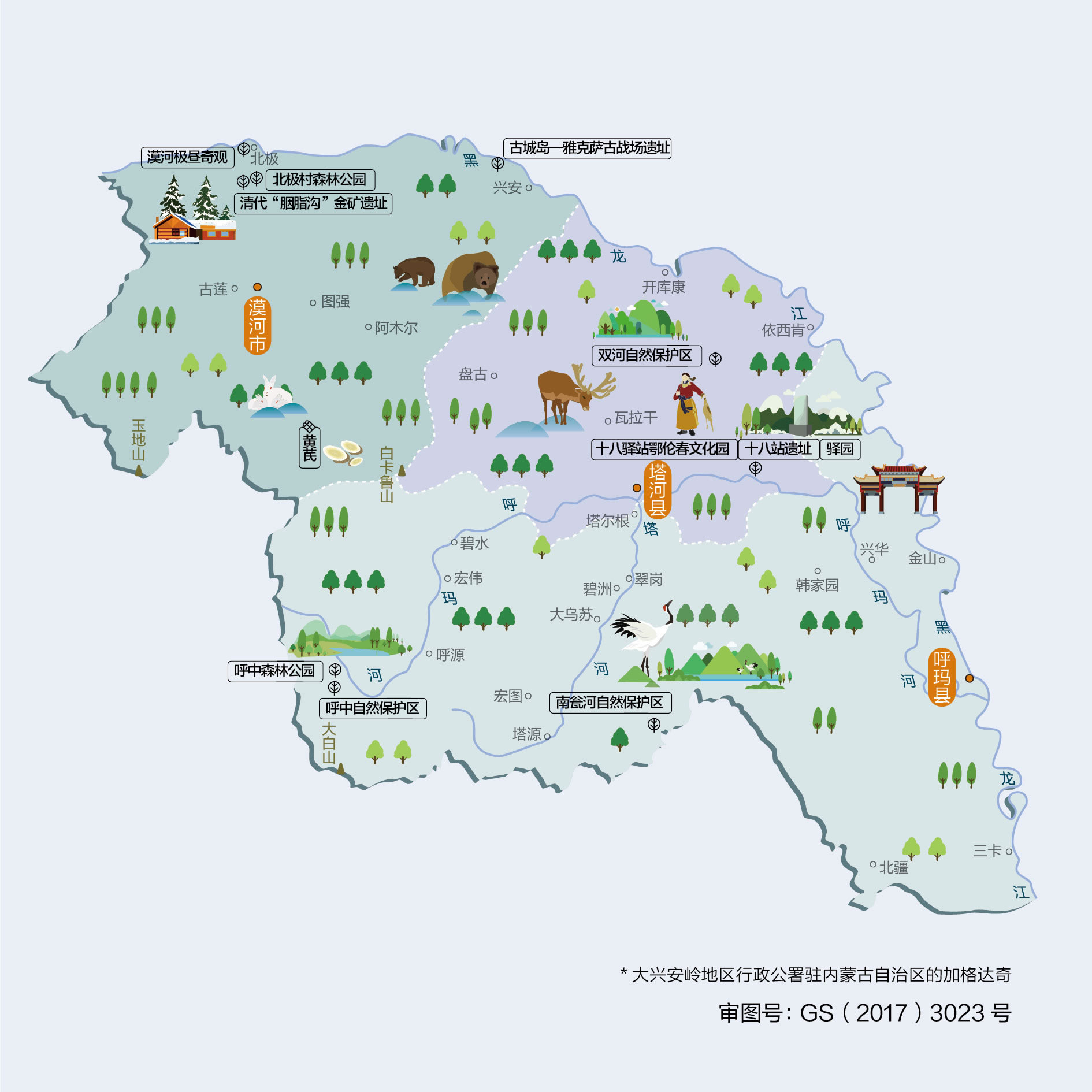 大興安嶺地區(qū)轄4個(gè)區(qū)、1個(gè)縣級市、2個(gè)縣: