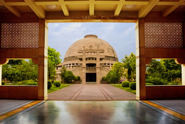 印度佛殿規(guī)劃占地6000平方米,建筑面積為3450平方米。主要建筑包括大佛殿、回廊、牌樓等,布局規(guī)整,別具匠心。大佛殿仿印度著名佛教遺址桑奇大塔建造。大佛殿中央供奉佛祖說(shuō)法像,表現(xiàn)佛陀在鹿野苑第一次說(shuō)法——說(shuō)四圣諦度五比丘的情景。頂部安裝有玻璃天窗,陽(yáng)光從天窗投射下去,照射在佛像周圍。大佛殿上下兩層塔身及殿門(mén)前牌坊上雕刻有佛本行故事與佛本生故事。大佛殿底部設(shè)計(jì)有水系。