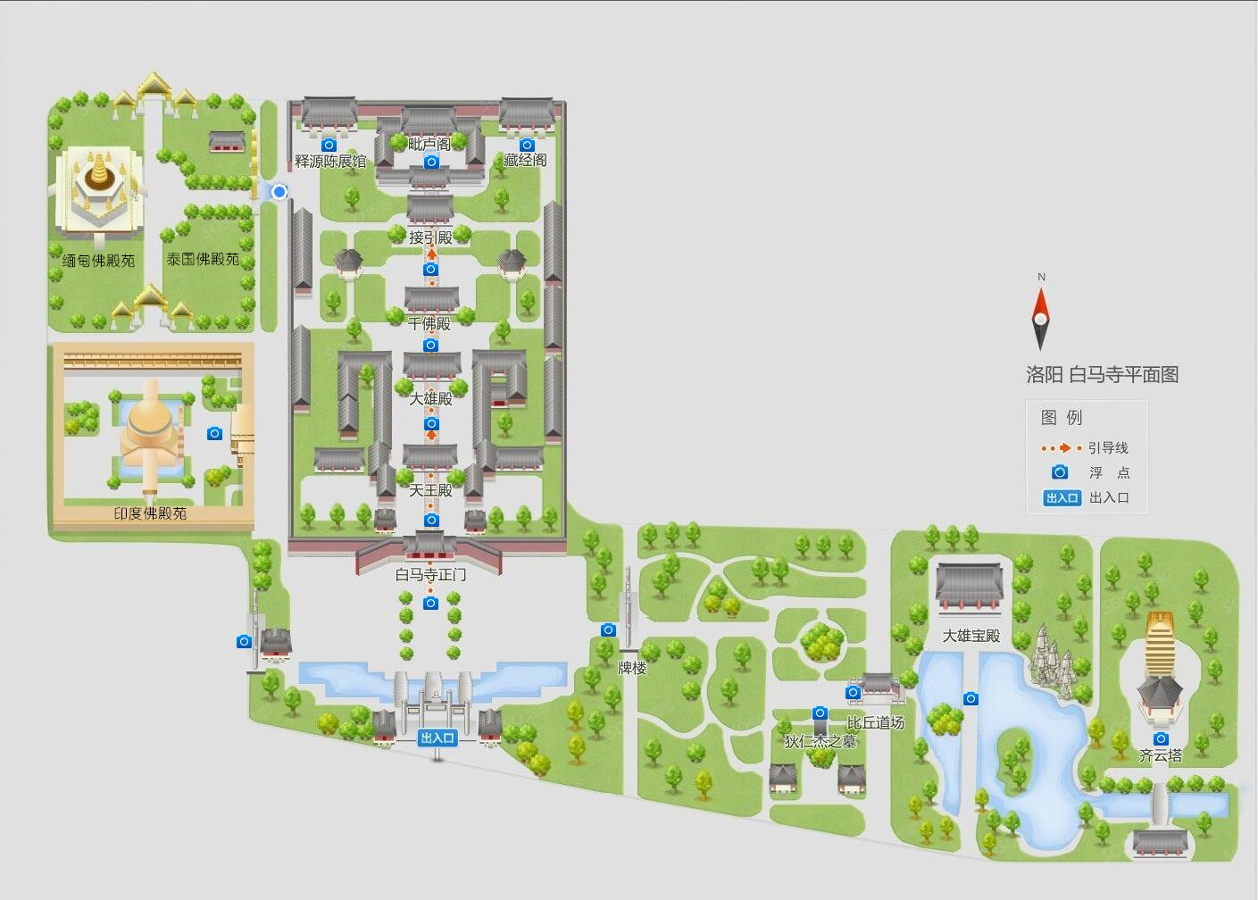 白馬寺古建區(qū)坐北朝南,為中軸對(duì)稱格局,布局規(guī)整,主次分明。寺內(nèi)主要建筑都分布在中軸線上,自南向北依次是山門(mén)、天王殿、大佛殿、大雄殿、接引殿和清涼臺(tái),兩側(cè)還有鐘鼓樓、門(mén)堂、云水堂、客堂、齋堂、祖堂、禪堂、方丈院等附屬建筑。