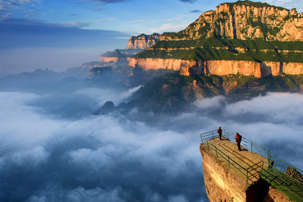 云峰畫廊是一條畫廊式的風光帶,位于老爺頂?shù)陌肷窖,由清峰關起,環(huán)周8千米,終點又回到清峰關。它依附老爺頂,連接豫晉關,遙望十字嶺,擷取太行山的精華,依山順勢建造了7個位置極佳的觀景臺,依次為聽禪臺、試膽臺、如畫臺、戲龍臺、丹鳳臺和歸真臺。