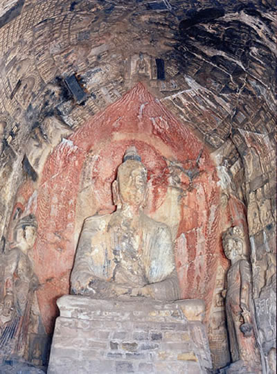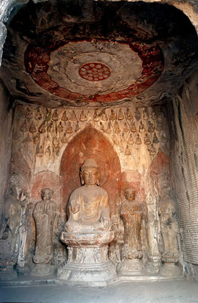 賓陽中洞是北魏時期(公元386~512年)的代表性作品。這個洞窟前后用了24年才建成,是開鑿時間最長的一個洞窟。洞內有11尊大佛像。主像釋迦牟尼像,面部清秀,神情自然,堪稱北魏中期石雕藝術的杰作。主像座前刻有兩只姿態(tài)雄健的石獅。左右侍立二弟子,二菩薩,菩薩像含笑凝眸,溫柔敦厚。洞中還雕刻著眾菩薩,弟子聽法的浮雕像,栩栩如生?唔旓w天仙子的刻畫也十分傳神。