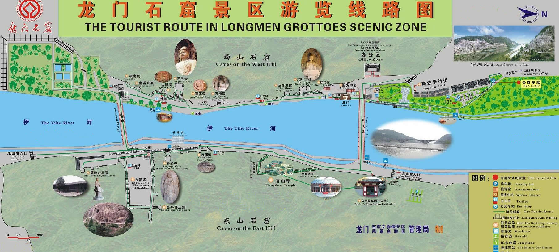龍門石窟與甘肅敦煌莫高窟、山西大同云岡石窟并稱為“中國三大石刻藝術寶庫”。石窟始鑿于北魏孝文帝時(公元471~477年),歷經(jīng)400余年才建成,迄今已有1500年的歷史,龍門石窟南北長約1公里,現(xiàn)存石窟1300多個,窟龕2345個,題記和碑刻3600余品,佛塔50余座,佛像97000余尊。其中以賓陽中洞、奉先寺和古陽洞最具有代表性。