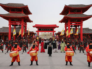 迎賓門是清明上河園的東大門,與之對應(yīng)的西門稱為金水門。迎賓門位于龍亭湖區(qū)域中心位置。每天上午9點清明上河園開園迎賓,故稱迎賓門。