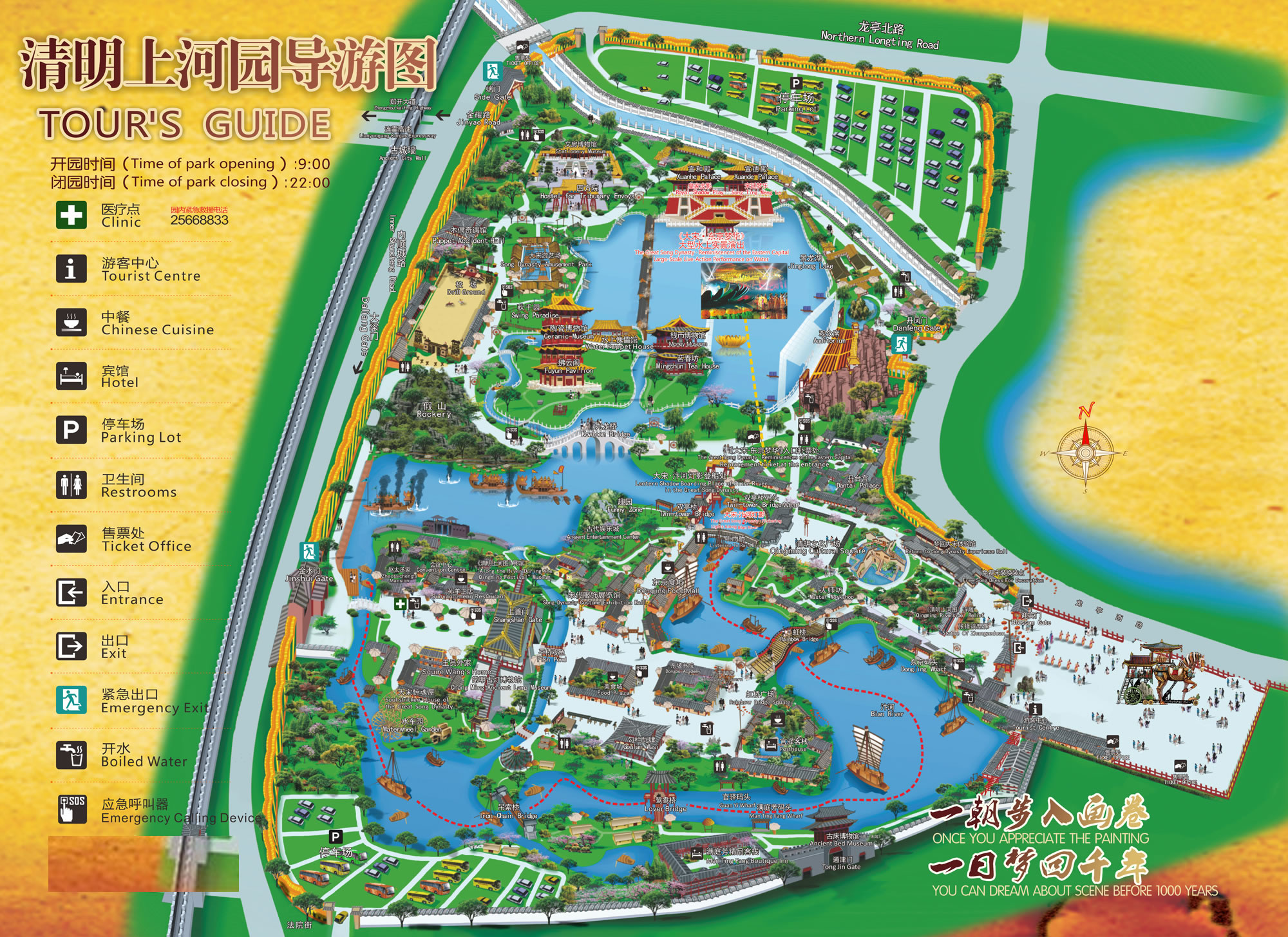 連霍高速、大廣高速、日南高速、鄭民高速均可到達清明上河園,導(dǎo)航清明上河園端門,進入北側(cè)1號停車場。