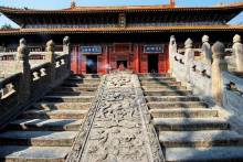 峻極殿前筑有3米高的月臺,周圍有石雕欄桿,月臺正面有三道石階。中間的臺階分二路,二路間鑲有垂帶式“御路”一石,上面浮雕著精美的圖案,上截為“獨(dú)龍盤踞”,中間為“雙龍戲珠”,下邊為“群鶴鬧蓮”等紋飾。月臺下面為拜臺,左右為兩座秀麗的御碑亭,兩亭均為重檐八角,東為“御捍亭”,內(nèi)立清乾隆十五年(1750年)的御碑,西為“御帛亭”,內(nèi)立清乾隆四十八年(1783年)的御碑,其字乃草書。