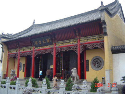 中院的主體建筑是大雄寶殿。該殿初建于清順治十八年(1661年),后經(jīng)多次維修,F(xiàn)大雄寶殿是清光緒三十四年(1908年)重修,經(jīng)過近年來的維修,氣勢宏偉。大殿正中供奉著釋迦牟尼坐像,兩側(cè)為其弟子阿難和迦葉,均為托沙雕塑。釋迦“偏袒右肩,結(jié)跏趺坐”,十分莊嚴(yán)靜穆,威儀儼然。佛像后的背光是用樟木雕刻而成的“五龍捧圣”的圖案。佛像前還有韋馱、彌勒、地藏像,佛像后是一組海島觀音像,只見海島觀音赤足站在鰲頭上,左右侍立著龍女和童子,背后是一面高達(dá)八尺的泥塑懸崖峭壁,足下碧波萬頃,怒濤洶涌。整個塑像向前傾覆。人們仰視上去,只見觀音衣袖似在飄動,正在洶涌的波濤上迎面向你浮來,增加了宗教藝術(shù)的感染力。