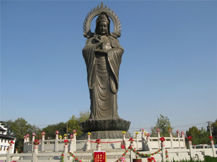 觀音菩薩為雙面造型,黃銅鑄造,周圍是漢白玉欄桿,像高18.8米,立于一個3米高的蓮臺之上,重達(dá)20噸,雙面觀音為二臂正觀音基本形,也稱為圣觀音像。