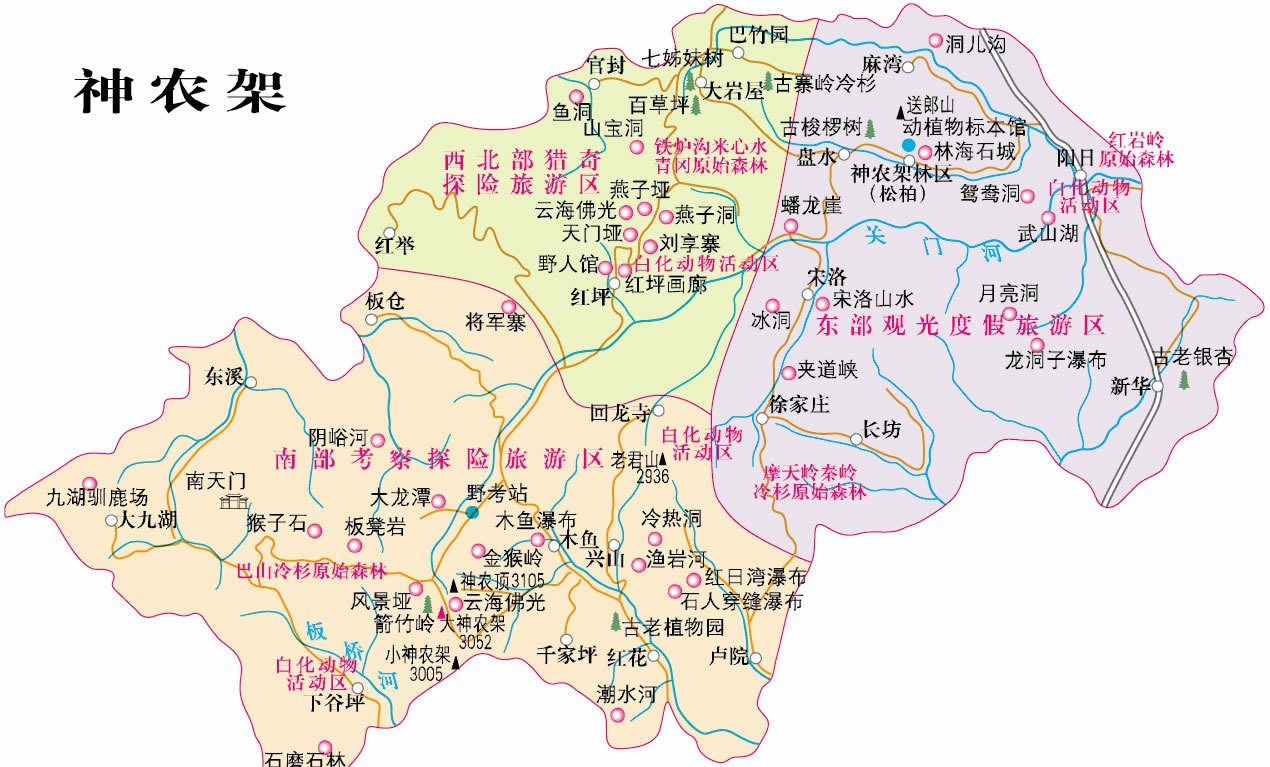 神農(nóng)架是我國內(nèi)陸保存完好的唯一一片綠洲和世界中緯度地區(qū)唯一的一塊綠色寶地。它所擁有的在當(dāng)今世界中緯度地區(qū)唯一保持完好的亞熱帶森林生態(tài)系統(tǒng),是最富特色的壟斷性的世界級旅游資源,動植物區(qū)系成分豐富多彩,古老、特有而且珍稀。蒼勁挺拔的冷杉、古樸郁香的巖柏、雍容華貴的梭羅、風(fēng)度翩翩的珙桐、獨占一方的鐵堅杉,枝繁葉茂,遮天蔽日;金絲猴、白熊、蘇門羚、大鯢以及白鸛、白鶴、金雕等走獸飛禽出沒草叢,翔天林間。一切是那樣地和諧寧靜,自在安詳。這里還有著優(yōu)美而古老的傳說和古樸而神秘的民風(fēng)民俗,人與自然其同構(gòu)成我國內(nèi)地的高山原始生態(tài)文化圈。神農(nóng)氏嘗草采藥的傳說、“野人”之謎、漢民族神話史詩《黑暗傳》、川鄂古鹽道、土家婚俗、山鄉(xiāng)情韻都具有令人神往的誘惑力。這里山峰瑰麗,清泉甘冽,風(fēng)景絕妙。神農(nóng)頂雄踞“華中第一峰”,風(fēng)景埡名躋“神農(nóng)第一景”;紅坪峽谷、關(guān)門河峽谷、夾道河峽谷、野馬河峽谷雄偉壯觀;陰峪河、沿渡河、香溪河、大九湖風(fēng)光綺麗;萬燕棲息的燕子洞、時冷時熱的冷熱洞、盛夏冰封的冰洞、一天三潮的潮水洞、雷響出魚的錢魚洞令人叫絕;流泉飛瀑、云海佛光皆為大觀。