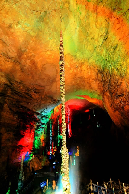 飛流直下三千尺,疑是銀河落九天。天仙水位于黃龍洞天仙宮景區(qū),是我國已開發(fā)的溶洞中流量最大、落差最高的一個懸空瀑布。它的落差高達(dá)27.3米,從洞頂石窟直瀉而下,飛珠濺玉,氣勢磅礴,四季長流不竭。
