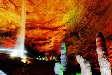 黃龍洞以立體的洞穴結(jié)構(gòu),龐大的洞穴空間,寬闊的廳堂及數(shù)以萬計(jì)的石筍,高大的洞穴瀑布,水陸兼?zhèn)涞挠斡[線等優(yōu)勢構(gòu)成了極具特色的游覽洞穴,洞內(nèi)有1庫、2河、3潭、4瀑、13大廳、98廊,以及幾十座山峰,上千個白玉池和近萬根石筍。由石灰質(zhì)溶液凝結(jié)而成的石鐘乳、石筍、石柱、石花、石幔、石枝、石管、石珍珠、石珊瑚等遍布其中,無所不奇,無奇不有,仿佛一座神奇的地下“魔宮”。黃龍洞現(xiàn)已開放有龍舞廳、響水河、天柱街、天仙瀑、龍宮等6大游覽區(qū),主要景觀有定海神針、萬年雪松、龍王寶座、火箭升空、花果山、天仙瀑布、海螺吹天、雙門迎賓、滄海桑田、黃土高坡等100多個。