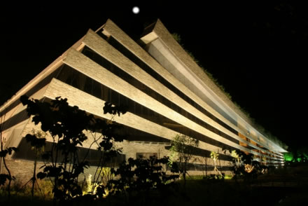 黃龍音樂廳位于生態(tài)廣場入口處,由黃龍洞投資股份有限公司按國際標(biāo)準(zhǔn)建設(shè),建筑面積為4970平方米,總投資1.6億元,座位818個。該音樂廳背靠植被茂盛的黃龍洞山體,面朝浩瀚的稻田,南鄰潺潺東流的索溪水。整個建筑為框剪式結(jié)構(gòu),3250平方米斜坡面屋頂全部為綠茵花草屋蓋,是全球最大的綠化屋頂;其外墻由當(dāng)?shù)厍嗍搸r構(gòu)建成的音符弦線幕墻與自然融合一體,形如一本即將展開等待世人閱讀的張家界文化寶典,又如鑲嵌在張家界的一塊翡翠,被譽(yù)為“世界環(huán)境最美音樂廳”。