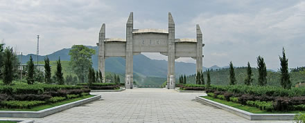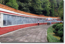 一進(jìn)為午門,拱形石門,高4.0米、寬2.6米,門前為長寬均為50米的朝覲廣場(chǎng),左右分列為拱形戟門和長方形掖門,門扇均為實(shí)榻大門。進(jìn)午門正中,樹立國家主席江澤民1993年9月4日親筆題寫的“炎帝陵”漢白玉石碑,前嵌盤龍龍陛,取名龍?bào)椿⒕,天下一統(tǒng),江山穩(wěn)固之意。左右分立雄健的山鷹和白鹿花崗石雕。