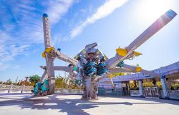 亞洲首臺末排反向座椅過山車掠食者重磅駕到,大眼魔怪的車體包裝,門頭的巨鷹雕塑也氣場一米八,無踏板懸空式的自由落地,趕得上5G速度。