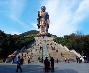 矗立在小靈山南麓的靈山大佛,包括蓮花座在內(nèi)通高為八十八米,相當(dāng)于一幢三十馀層樓房的高度,比“山是一尊佛,佛是一座山”的四川樂山大佛還要高出十七米,是迄今為止我國最高的巨型佛像。如果加上三層座基,總