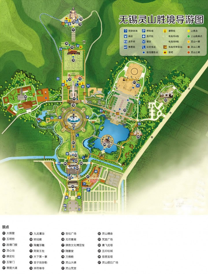 靈山大佛景區(qū)位于無錫太湖國家旅游度假區(qū),占地面積約30公頃。從靈湖大型果園停車場步行至照壁廣場,可見三山環(huán)抱,靈山大佛巍然屹立,氣勢雄偉壯觀。大佛南面太湖,背倚靈山,左挽青龍(山),右牽白虎(山),地靈形勝,風(fēng)水佳絕,為難得之佛國寶地。靈山大照壁可謂