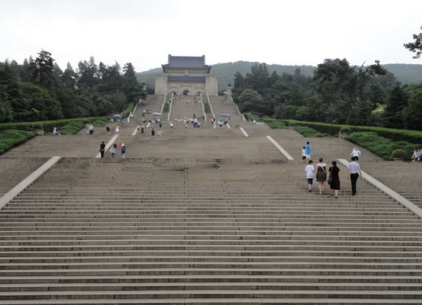 而從碑亭到祭堂,共有石階339級,象征當時國民黨參眾二院議員為339人,寓意每人作為一個臺階,將中山先生的精神發(fā)揚光大,其中的9寓意九州大同。迎面的這一段共有290階,分為8段,象征著三民主義五權(quán)憲法。臺階全部用蘇州金山花崗石砌成。最高的平臺有華表兩座,后為祭堂。