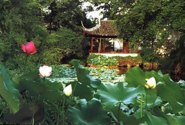 ( 4)園林景觀,花木為勝。拙政園向以“林木絕勝”著稱。數(shù)百年來一脈相承,沿襲不衰。早期王氏拙政園三十一景中,三分之二景觀取自植物題材,如桃花片,“夾岸植桃,花時望若紅霞”;竹澗,“夾澗美竹千挺”,“境特幽回”;瑤圃百本,花時燦若瑤華!睔w田園居也是叢桂參差,垂柳拂地,“林木茂密,石蘚然”。每至春日,山茶如火,玉蘭如雪。杏花盛開,“遮映落霞迷澗壑”。夏日之荷。秋日之木芙蓉,如錦帳重疊。冬日老梅偃仰屈曲,獨傲冰霜。有泛紅軒、至梅亭、竹香廊、竹郵、紫藤塢、奪花漳澗等景觀。至今,拙政園仍然保持了以植物景觀取勝的傳統(tǒng),荷花、山茶、杜鵑為著名的三大特色花卉。僅中部二十三處景觀,百分之八十是以植物為主景的景觀。如遠(yuǎn)香堂、荷風(fēng)四面亭的荷(“香遠(yuǎn)益清”,“荷風(fēng)來四面”);倚玉軒、玲瓏館的竹(“倚楹碧玉萬竿長”,“月光穿竹翠玲瓏”);待霜亭的桔(“洞庭須待滿林霜”);聽雨軒的竹、荷、芭蕉(“聽雨入秋竹”,“蕉葉半黃荷葉碧,兩家秋雨一家聲”);玉蘭堂的玉蘭(“此生當(dāng)如玉蘭潔”);雪香云蔚亭的梅(“遙知不是雪,為有暗香來”);聽松風(fēng)處的松(“風(fēng)入寒松聲自古”),以及海棠春塢的海棠,柳陰路曲的柳,批把園、嘉實亭的批把,得真亭的松、竹、柏等等。