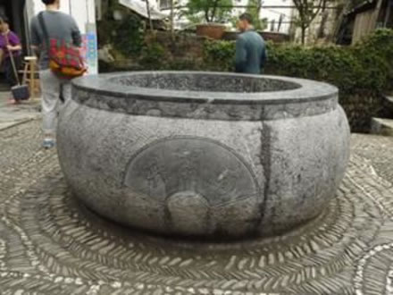 北斗七星井位于江西省上饒市婺源縣江灣鎮(zhèn)江灣景區(qū)內(nèi),北斗七星井體現(xiàn)了”天、地、人合一”的中國風(fēng)水學(xué)最高原則,南側(cè)梨園河呈太極圖“S”形系。北宋初年,南唐國師何令通遭貶來到江灣靈山隱居,與蕭江六世祖江文采交往甚篤,便指引蕭江氏族人由旃坑遷居風(fēng)水寶地云灣(現(xiàn)為江灣)。蕭江先祖在他的指引下,利用風(fēng)水學(xué)的最高原理,對(duì)江灣的水系環(huán)境、建筑布局、街衢走向,山脈走勢等方面進(jìn)行了改造。族人自遷云灣后人丁日益興旺、科第舉發(fā),其中村內(nèi)的北斗七星井便是國師運(yùn)用風(fēng)水學(xué)的典范。 中國古代的四個(gè)方位分別是“前朱雀后玄武、左青龍右白虎”,而江灣的地勢是玄武(后龍山)偏低,朱雀(對(duì)面攸山)偏高,朱雀屬火,也就是說南方火勢較旺,是一個(gè)較為不利的地形。當(dāng)時(shí)何令通便想出在村中挖七口井,并按北斗七星狀分布,以七井之水鎮(zhèn)住攸山火勢。而北斗七星分布又是呈勺子狀的,從此,村內(nèi)即有了充足水源又有了舀水的勺子,攸山之火自然就被鎮(zhèn)住了。