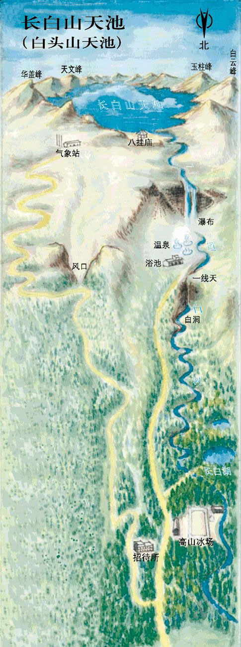 二道白河直接發(fā)源于長(zhǎng)白山天池,是第西流松花江的正源,鴨綠江發(fā)源于長(zhǎng)白山天池南麓,圖們江源于長(zhǎng)白山天池東麓。 [10]天池北側(cè)有一缺口,古稱闥門,水北流稱乘槎河(又稱通天河)。該河夾流在天豁峰與龍門峰之間,全長(zhǎng)1250米,在其盡頭形成高達(dá)68米的長(zhǎng)白瀑布,瀑布下有長(zhǎng)白溫泉,均與二道白河相通。