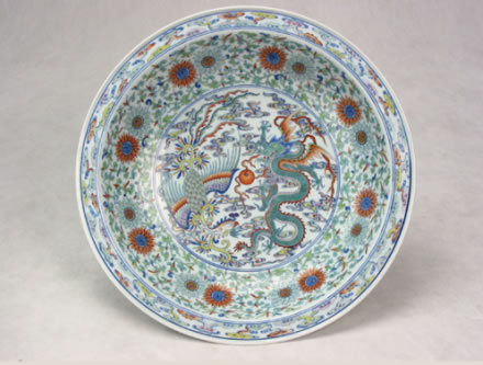 清雍正款斗彩龍鳳大盤:此盤為白地斗彩大盤,盤內(nèi)飾斗彩龍鳳戲珠紋,一條行云五爪飛龍,龍身蜿蜒矯健,鳳舞展翅穿于祥云之間,呈龍飛鳳舞圖案。盤外飾海水江崖,壽山福海。壽山上靈芝盛開,云蝠翩翩。底“大清雍正年制”六字兩行雙圈青花楷書書款。整個大盤胎質(zhì)細(xì)膩,釉色純正,造型規(guī)矩,為清宮祝壽時的御用器皿。