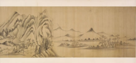 董其昌仿米黃山水圖卷:明晚期,絹本。用筆參以披麻與米點皴法,為其自家面貌。卷后部行書自題:“家有黃子久《富春大嶺圖》、米元暉《瀟湘圖》,和會兩家筆意為此卷,大都子久畫出于巨然與海岳父子同參也。”后署款:“董玄宰識”,下鈐“知制誥日講官”、“董其昌印”白文印二方?顐(cè)鈐“楨父審定”、“墨緣堂來氏收藏書畫記”二印。