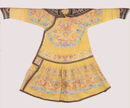 清明黃納紗五彩金龍夏朝服:清代光緒皇帝載湉御用。此朝服是夏季禮服之一,為其登基、大婚、萬壽圣節(jié)、祭天等重大典禮和祭祀活動時所穿禮服。為明黃顏色,是一種披肩領(lǐng)、馬蹄袖的大襟袍。披肩為黑紗地納紗繡平金龍二條,上衣兩肩和前胸、后背飾正龍各一條,飾有傳統(tǒng)紋樣十二章,間以五色云紋,下幅為平水紋飾。