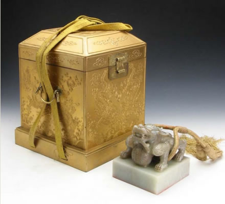 清世宗憲皇帝謚寶:此寶為嘉慶四年(1799)清宮內(nèi)府遵旨由舊寶改鐫而成。寶上部為單體蹲龍紐,描金,紐上系明黃絲繩。謚寶文字為滿、漢文合璧,均為朱文,右側(cè)為漢文篆書四行,左側(cè)為滿文篆書四行。其文為“世宗敬天昌運(yùn)建中表正文武英明寬仁信毅睿圣大孝至誠憲皇帝之寶”。謚寶外包明黃織金四則團(tuán)花暗云紋錦包袱皮,用雙層龍鳳紋金漆套盒盛裝。該寶于嘉慶四年改鐫后由北京送至盛京太廟尊藏,清末民國時期存于沈陽故宮崇謨閣內(nèi)。