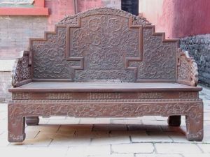 崇政殿室內(nèi)的寶座、屏風(fēng)等陳設(shè),并非清太宗時期的原貌,而是乾隆十二年(1747年)根據(jù)皇帝的旨意重新設(shè)計制做的,堂陛之內(nèi)的屏風(fēng)寶座,是乾隆特命仿北京故宮乾清宮所用加以縮小精心制作的,寶座、屏風(fēng)各以九條龍做為主要裝飾,全部罩以金漆,體現(xiàn)其唯一的使用者──皇帝的無上尊嚴(yán)。屏風(fēng)上的四言十二句銘文,與乾清宮屏風(fēng)上的完全相同 ,是康熙皇帝從古代經(jīng)書中摘出,做為自己和后世皇帝治理國家的座右銘鐫刻在御座之旁的。陳設(shè)在龍椅前后的鶴式燭臺、熏爐、塔式香亭、 端、“太平有象”等,都是乾隆年間宮中精制的琺瑯禮器,專用于皇帝御座周圍,既為熏香之用,也有驅(qū)邪諏吉的寓意,使得“真龍?zhí)熳印迸R朝理政之處更具有莊嚴(yán)神圣的氣氛。乾隆、嘉慶、道光幾位皇帝東巡盛京期間,都曾坐在這里接受群臣的朝賀叩拜,慶祝自己祭陵大典的成功。