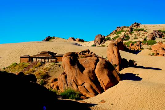 赤峰市西拉沐淪河兩岸,是著名的科爾沁沙地的組成部分,有“八百里瀚!敝Q。翁牛特旗的其甘、布日敦、勃隆克山等地,是典型的科爾沁沙地發(fā)育區(qū)。到此旅游,既可以一睹“長河落日圓,大漠孤煙直”的沙漠風采,又可以體味沙漠與綠洲、湖泊相生相伴的沙地獨特景觀。