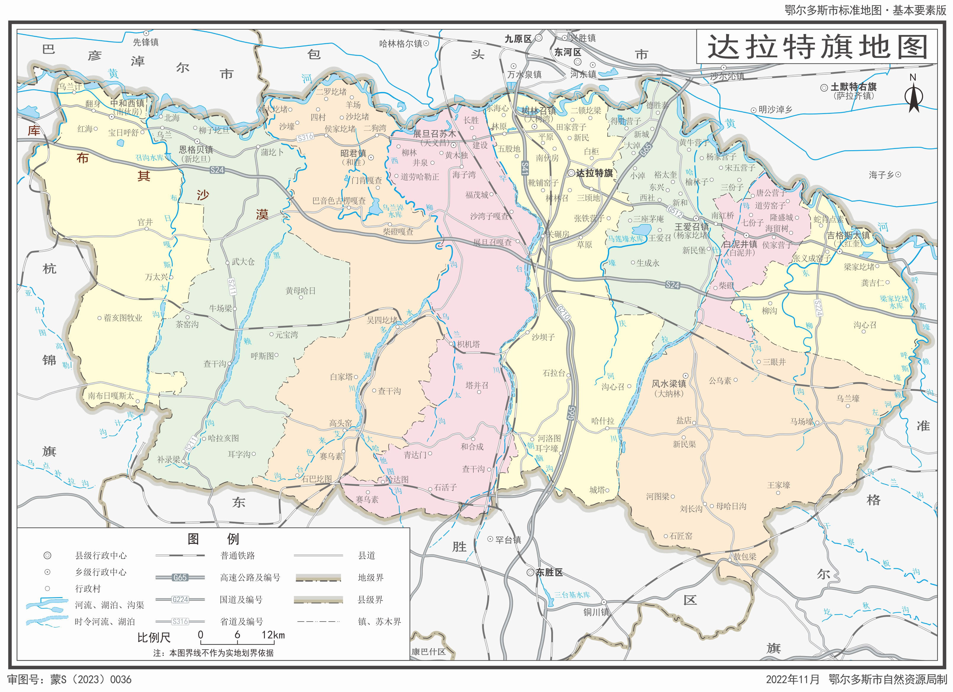 鎮(zhèn):樹林召鎮(zhèn)、白泥井鎮(zhèn)、大樹灣鎮(zhèn)、解放灘鎮(zhèn)、高頭窯鎮(zhèn)、耳字壕鎮(zhèn)、中和西鎮(zhèn)、吉格斯太鎮(zhèn)、王愛召鎮(zhèn)