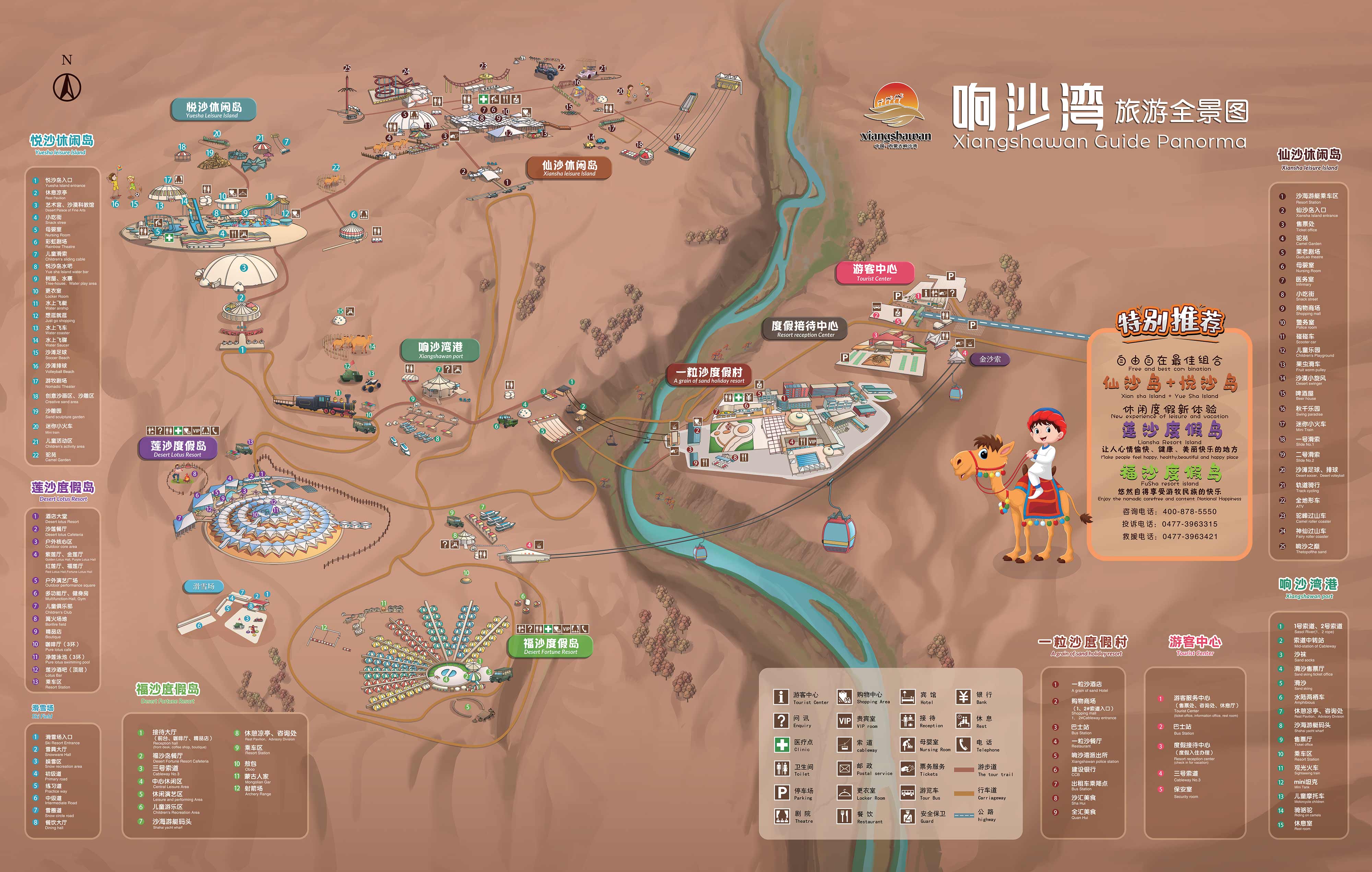 基于獨(dú)特的地形地貌及地理位置,響沙灣發(fā)展為集觀光與休閑度假為一體的特大綜合型沙漠休閑度假景區(qū),包含蓮沙度假島、福沙度假島、一粒沙度假村、悅沙休閑島、仙沙休閑島五個區(qū)域。