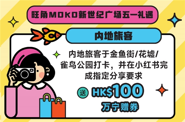 針對游客需求的變化,香港政府推出相關(guān)扶持政策,以支持區(qū)域特色打卡發(fā)展。以香港最著名的旅游區(qū)、購物區(qū)和美食區(qū)旺角為例,為了迎接內(nèi)地游客,香港政府在金魚街、花墟、雀仔公園設置不同打卡裝置。當?shù)氐纳虉鲆餐ㄟ^各種舉措歡迎內(nèi)地游客。旺角地標MOKO新世紀廣場面向內(nèi)地游客推出專享優(yōu)惠“日夜打卡繽紛禮”,于以上景點打卡分享到小紅書社交媒體及完成指定要求,可免費領(lǐng)取總值100港幣的萬寧贈券一份,一鍵PO出雙倍快樂。