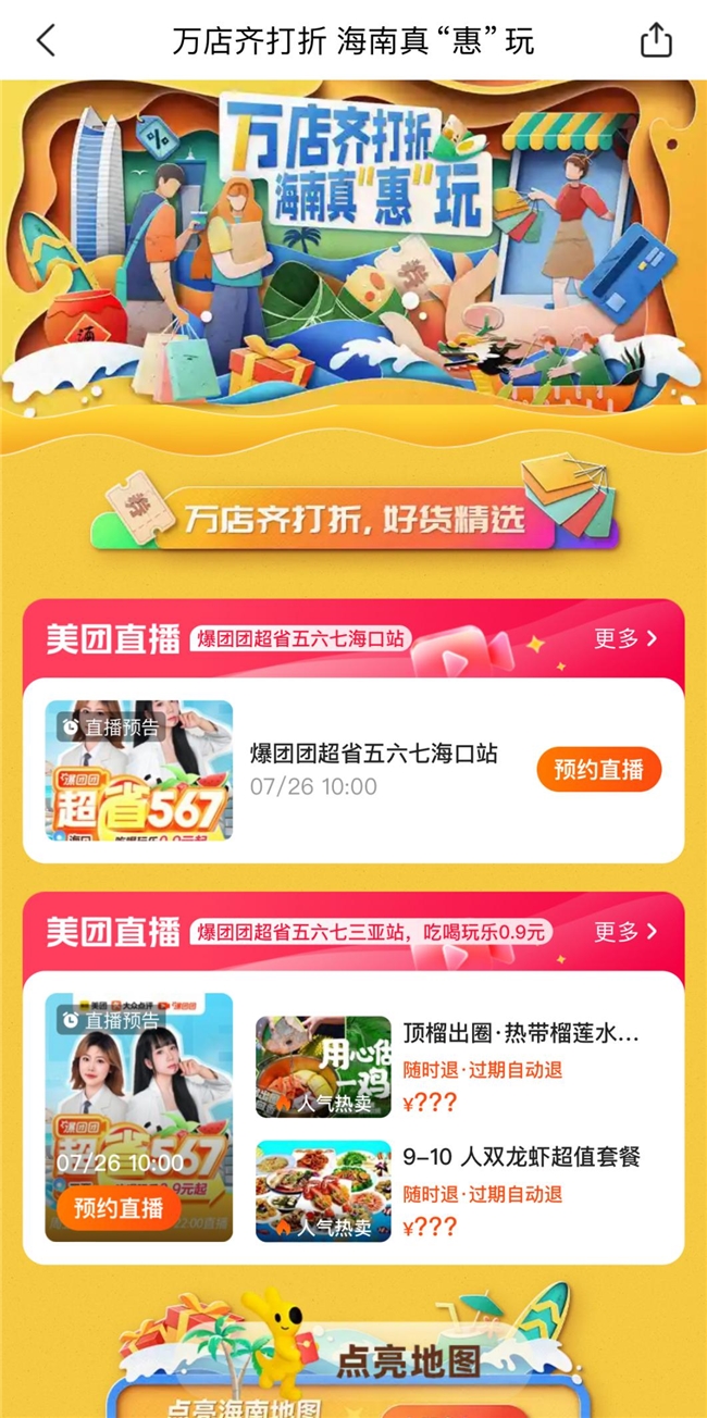 “萬店齊打折 海南真惠玩”主題營銷活動由海南省旅游和文化廣電體育廳和美團聯(lián)合發(fā)起,活動覆蓋了海南省內十八個城市,全品類商家紛紛參與,為游客們帶來了前所未有的優(yōu)惠和福利。活動期間海南省旅文廳聯(lián)合美團攜手一萬家商戶,為廣大消費者和游客提供了不低于1000萬遠的補貼折扣,用戶只要在美團App、大眾點評App搜索“萬店齊打折”等字樣,即可進入專題頁,參與各類福利活動。