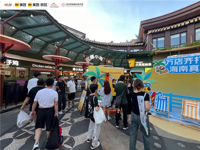 三亞海棠68環(huán)球美食街區(qū)同樣熱鬧非凡,“爆團團”爆品直播間活動落地線下,各種街區(qū)爆款秒殺活動讓游客們應接不暇。