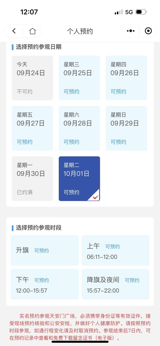 9月24日中午12時(shí),10月1日“升旗”時(shí)段的預(yù)約對(duì)外開放。不到半小時(shí),國(guó)慶節(jié)當(dāng)天“升旗”已經(jīng)全部約滿。