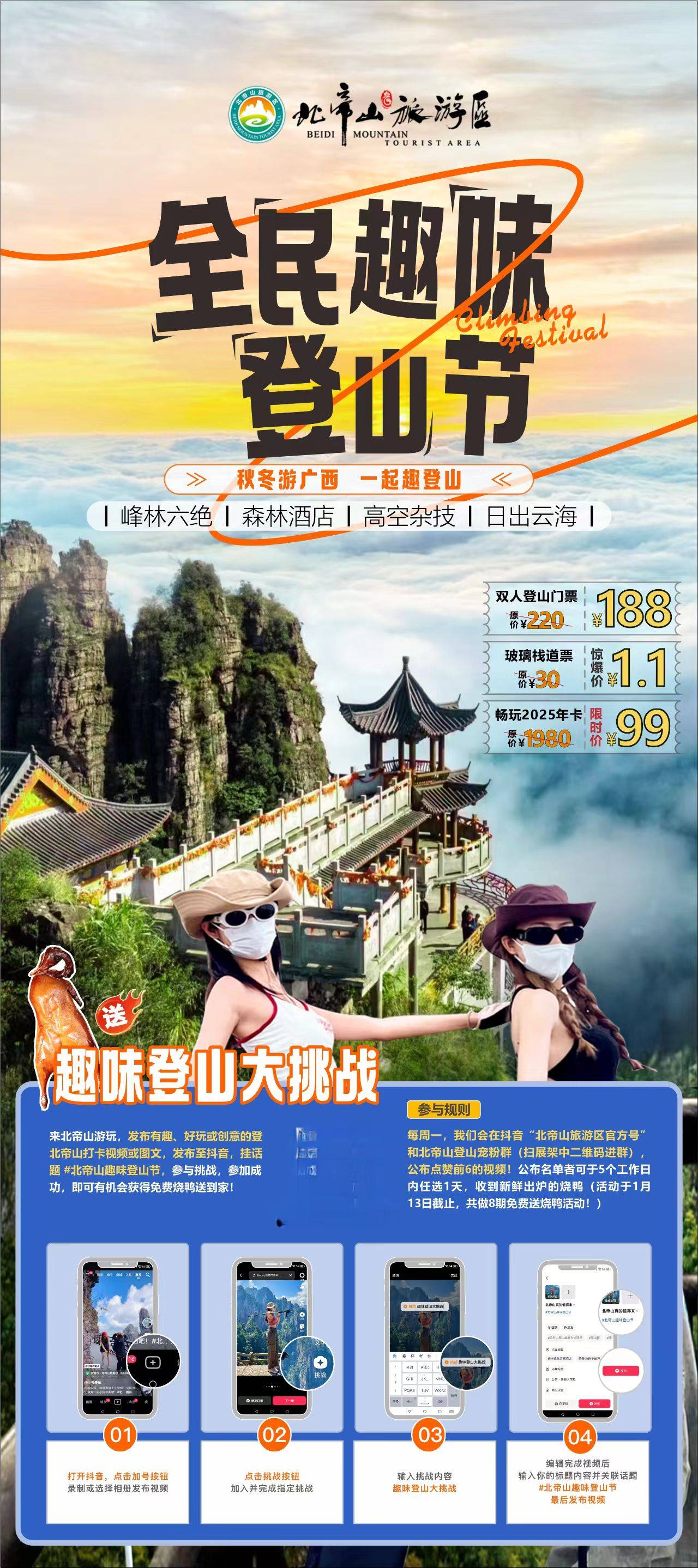 北帝山喊你來(lái)打卡!把你的鏡頭對(duì)準(zhǔn)北帝山,無(wú)論是打卡的、炫酷的、或搞笑的,只你大膽曬出來(lái)!發(fā)布至抖音,參加趣味登山大挑戰(zhàn)掛話題#北帝山趣味登山節(jié),即可參加成功贏免費(fèi)燒鴨送到家!