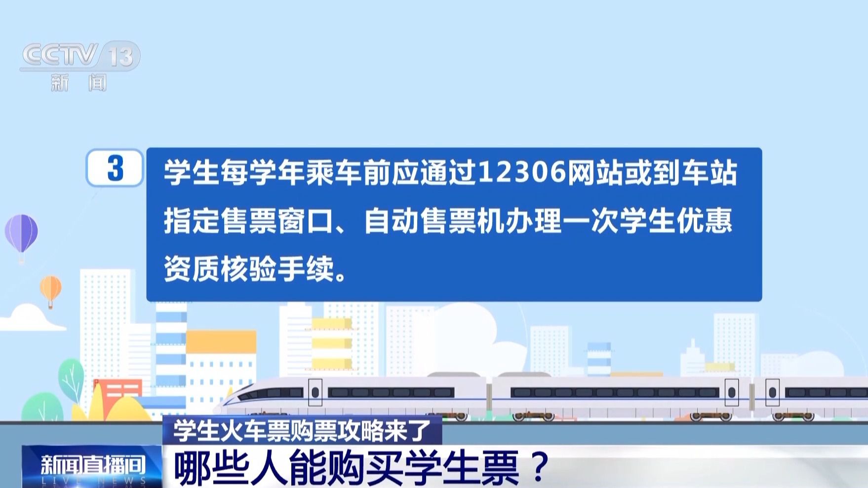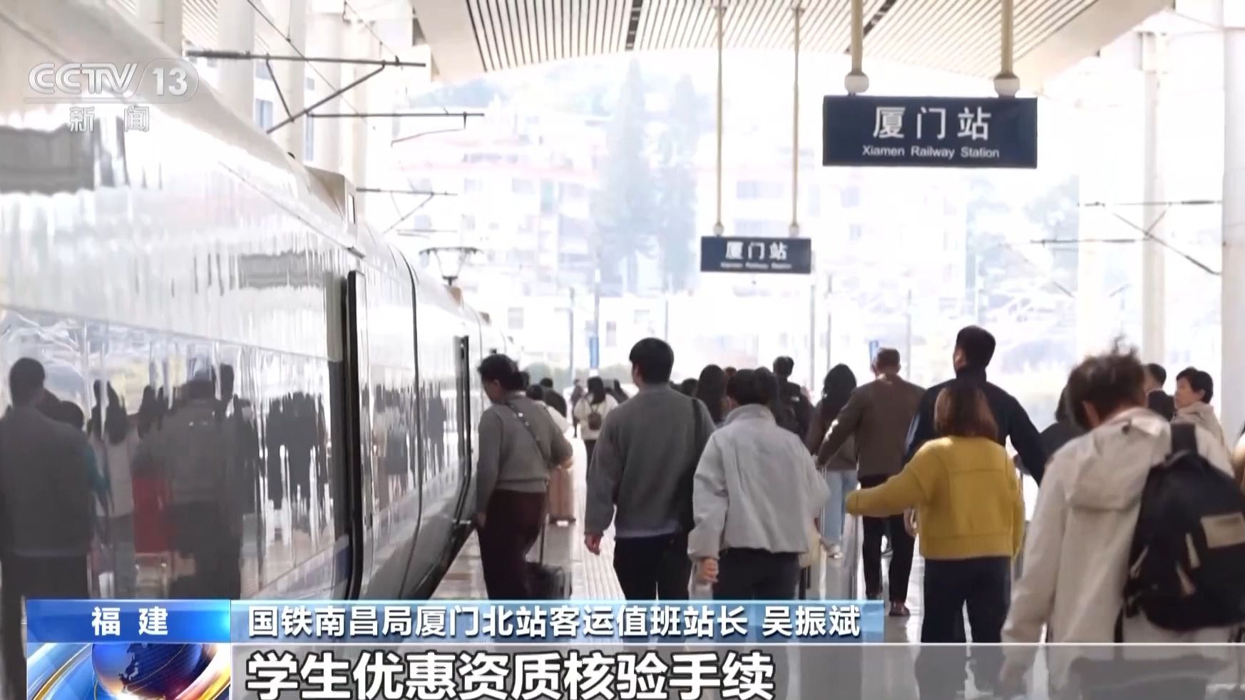 國鐵南昌局廈門北站客運(yùn)值班站長 吳振斌:現(xiàn)在中國高等教育學(xué)生信息網(wǎng)和鐵路12306系統(tǒng)已實(shí)現(xiàn)信息對接,學(xué)生旅客每學(xué)年乘車前可通過鐵路12306App在線辦理學(xué)生優(yōu)惠資質(zhì)核驗(yàn)手續(xù)。