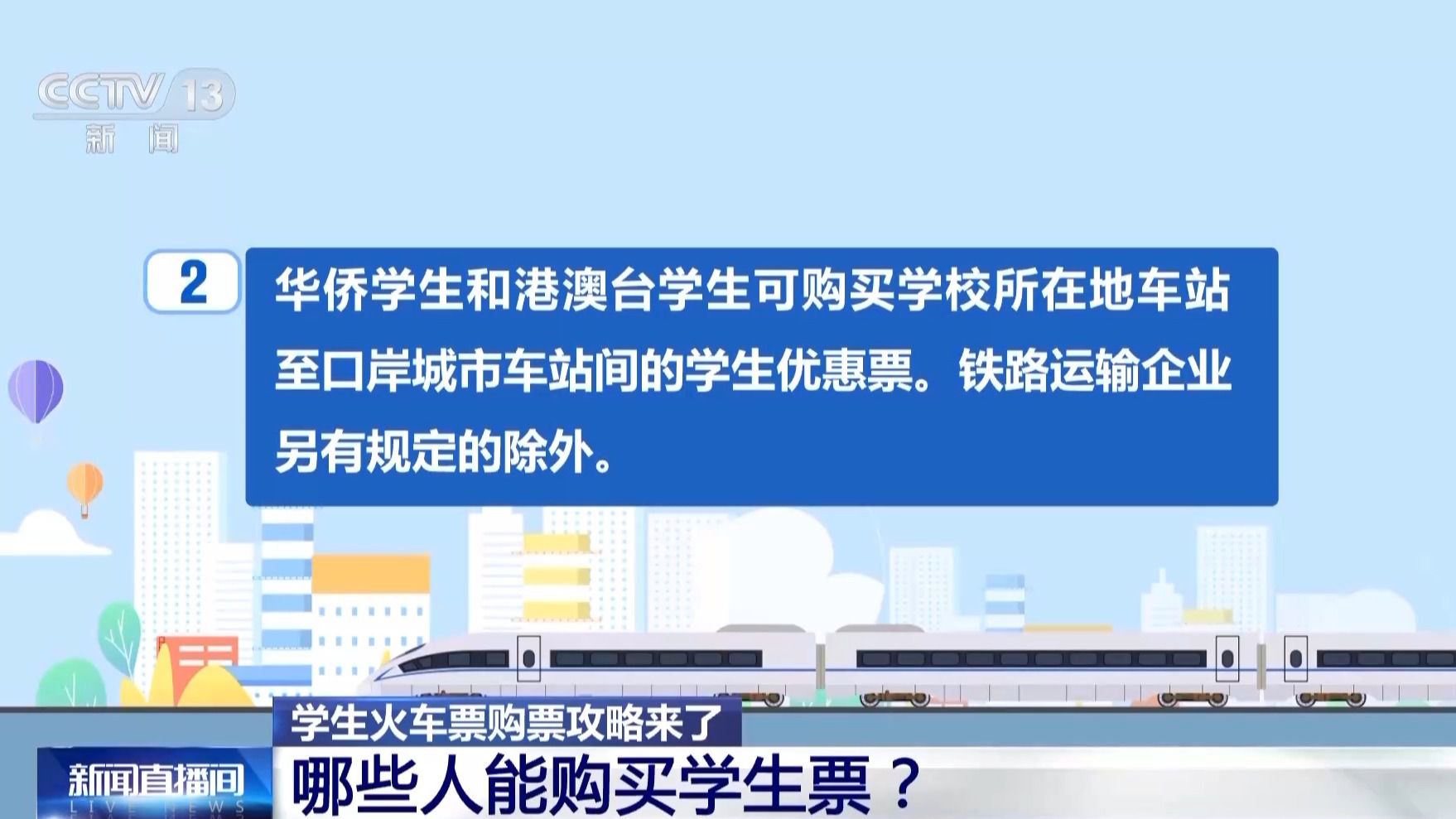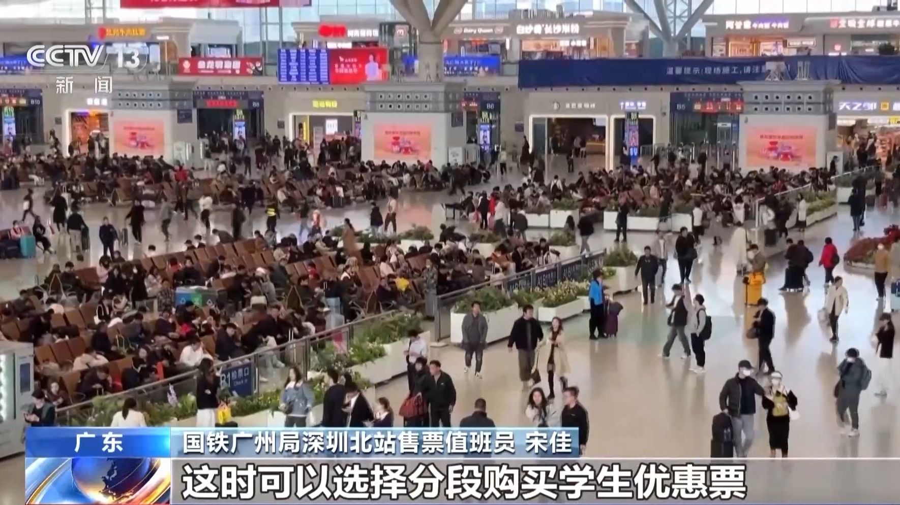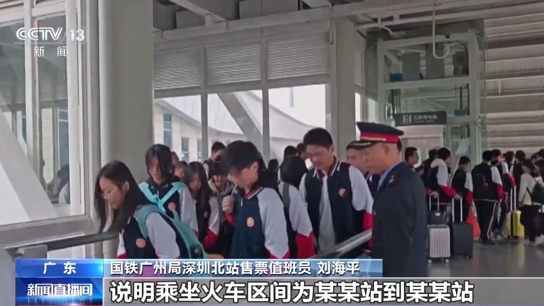 國鐵廣州局深圳北站售票值班員 劉海平:已滿14周歲的中學(xué)生需要購買學(xué)生票返鄉(xiāng),需要學(xué)校開具學(xué)籍證明,注明家庭地址,說明乘坐火車區(qū)間為某某站到某某站,加蓋學(xué)校公章,但是要去車站人工窗口辦理。(來源:央視新聞)