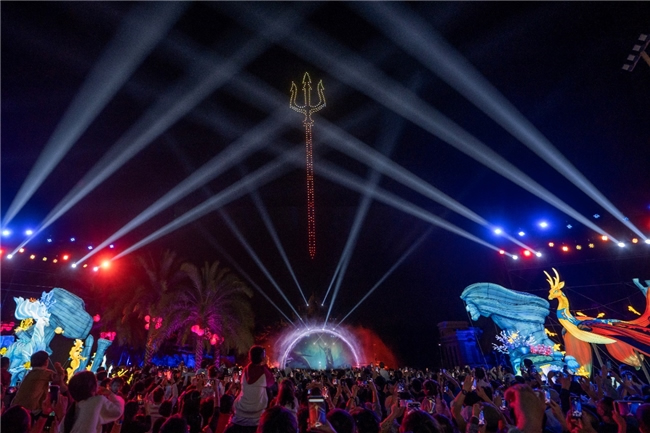 活動期間,每晚都會上演《深?駳g》無人機水幕秀。視頻內(nèi)容通過人工智能建模技術(shù),實現(xiàn)了角色形象的高精度三維重建,構(gòu)建出具有高度真實感和動態(tài)表現(xiàn)力的虛擬角色。隨著劇情的推進,數(shù)百架無人機在夜空中變幻多種圖案,點亮海棠夜空,演繹出獨屬于亞特蘭蒂斯的海底狂歡。