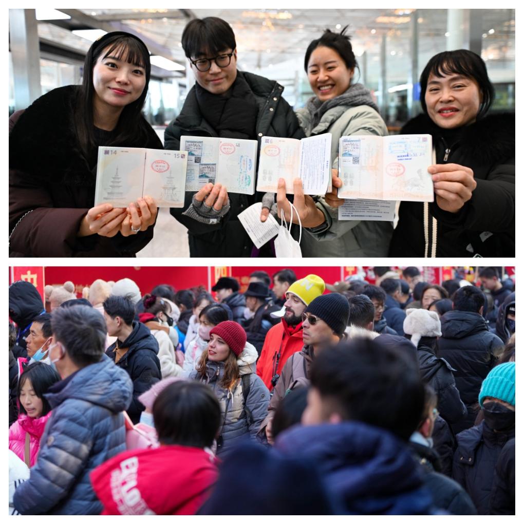拼圖:(上圖)1月28日,在首都國(guó)際機(jī)場(chǎng),四名韓國(guó)游客利用免簽政策來中國(guó)旅游,他們向記者展示著護(hù)照上的入境章。(下圖)1月29日,兩位來自西班牙的游客在北京地壇廟會(huì)游覽。