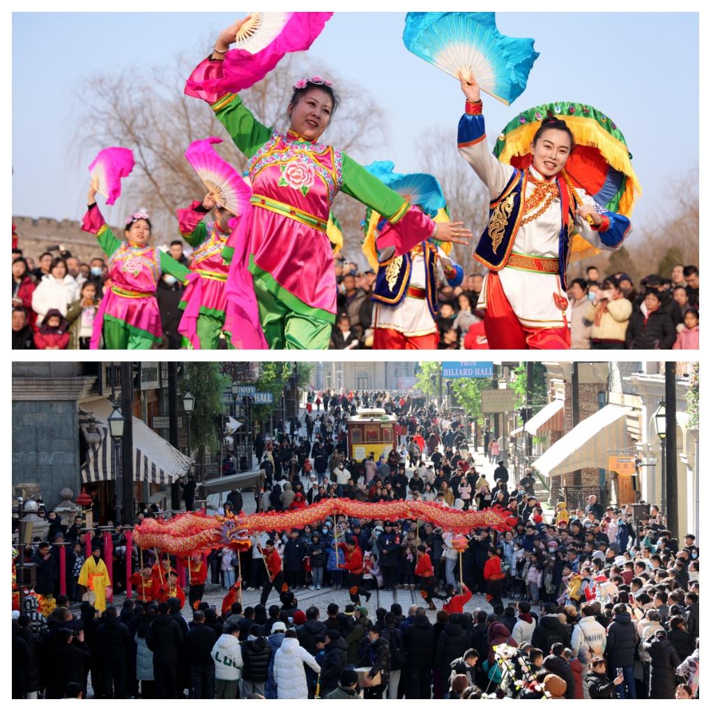 拼圖:(上圖)2月2日,在河北省石家莊市井陘縣天長(zhǎng)宋古城,民俗藝人為游客表演井陘拉花。(下圖)2月3日,游客在山東省樂陵市影視城觀看舞龍表演。